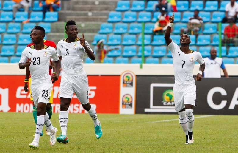 2015年2月1日,加納隊員阿特蘇(右)慶祝進球。新華社記者李京攝
