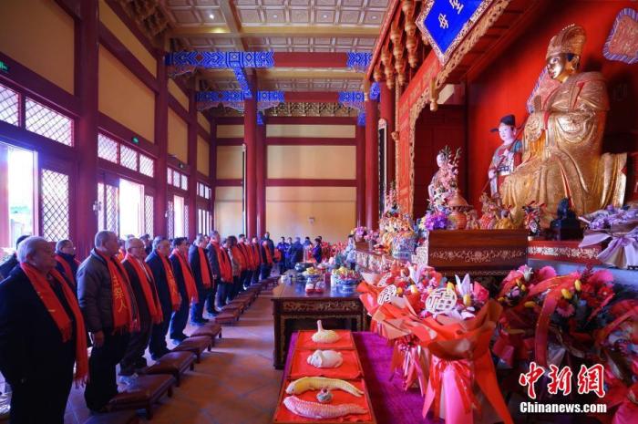 圖為參訪代表在天津媽祖文化園內祭拜。 中新社記者 佟郁 攝