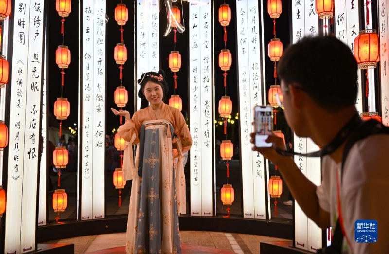 游客在??谌赵聫V場的古風市集拍照留念(2月19日攝)。