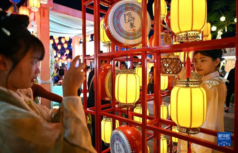 游客在海口日月廣場逛古風市集(2月19日攝)。