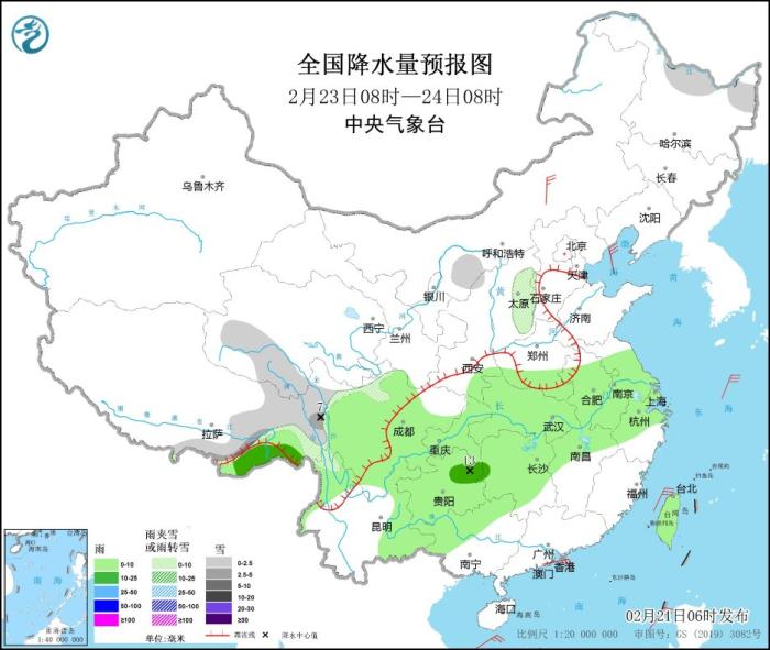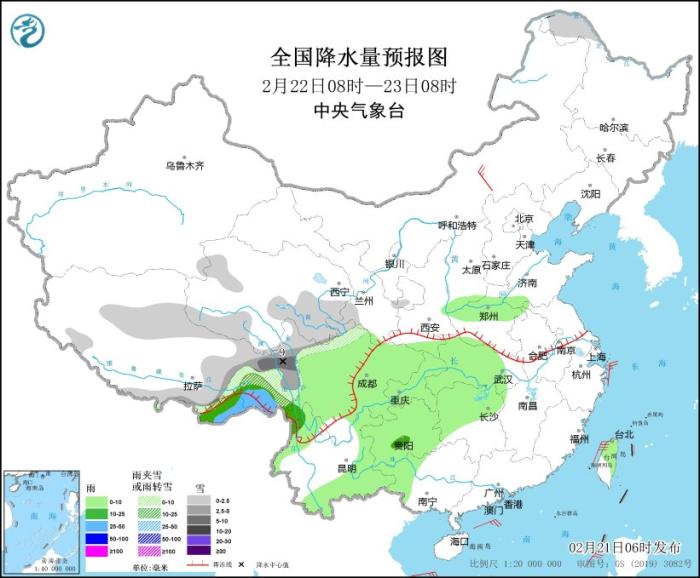 2月22日08時至23日08時,西藏北部和東部、青海南部、川西高原北部等地部分地區(qū)有小到中雪或雨夾雪,西藏東部等地局地有大雪。西南地區(qū)東部、河南北部、云南南部、湖南北部等地部分地區(qū)有小雨,貴州中部、西藏東部局地有中到大雨。內蒙古中部部分地區(qū)有4~5級風。臺灣海峽、巴士海峽、南海東北部等海域有7~8級風。