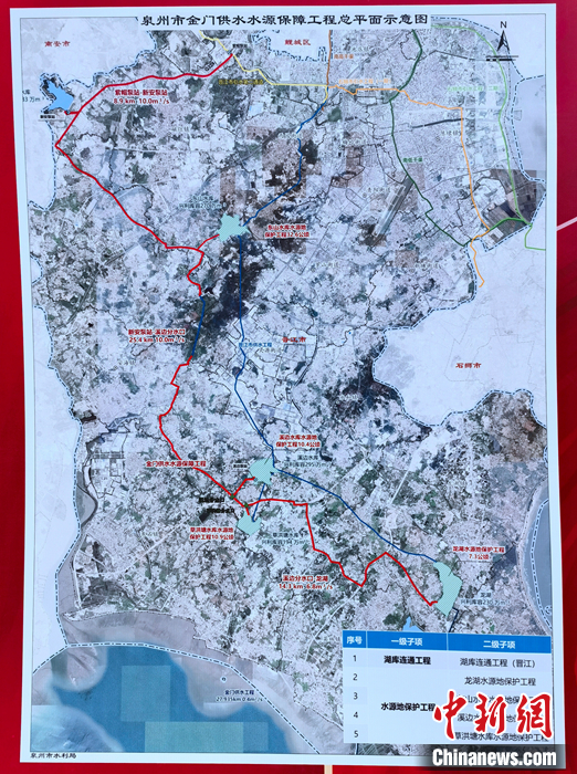 據(jù)福建省水利廳介紹,金門供水水源保障工程總工期41個月,包括湖庫連通工程、水源地保護工程兩大部分。其中,湖庫連通工程輸水設計流量為每秒6.8立方米,線路總長53公里,計劃從晉江引水第二通道引水,起點為紫帽泵站,沿線途經(jīng)10個鎮(zhèn)街,連通新安、東山、溪邊、草洪塘和龍湖等“四庫一湖”;水源地保護工程包括東山水庫、溪邊水庫、草洪塘水庫和龍湖等水源地。