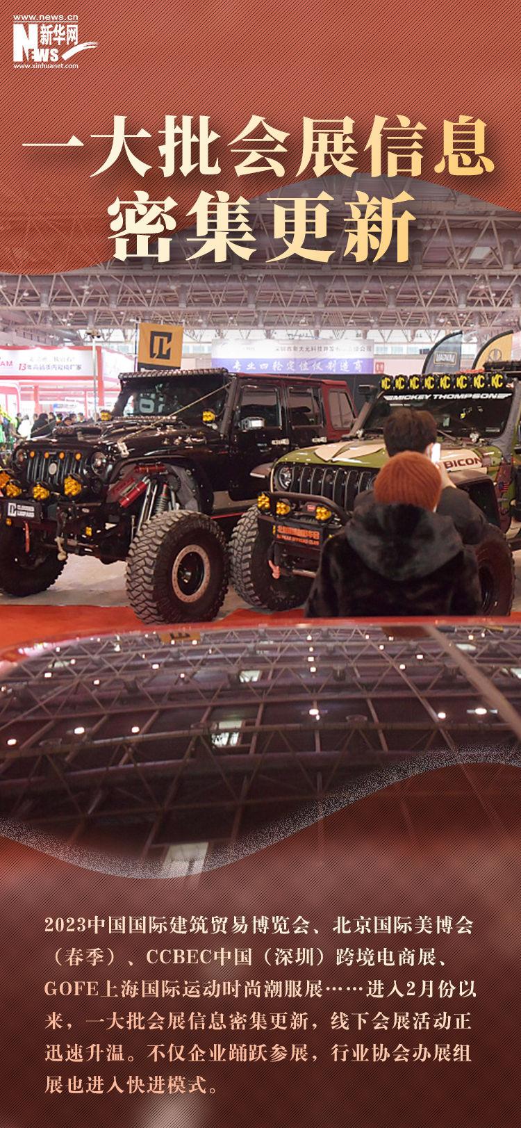 2023中國(guó)國(guó)際建筑貿(mào)易博覽會(huì)、北京國(guó)際美博會(huì)(春季)、CCBEC中國(guó)(深圳)跨境電商展、GOFE上海國(guó)際運(yùn)動(dòng)時(shí)尚潮服展……進(jìn)入2月份以來(lái),一大批會(huì)展信息密集更新。展示產(chǎn)品、結(jié)識(shí)客戶、交流信息、共尋商機(jī),線下會(huì)展活動(dòng)正迅速升溫。
