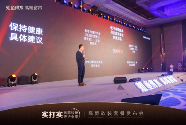 網(wǎng)易家居全國總編輯胡艷力則在會上深度剖析了窗簾行業(yè)發(fā)展趨勢,以及用戶對窗簾消費、審美、多樣化、智能常態(tài)化等需求的升級,同時呼吁人們?yōu)榱思胰私】?,?yīng)盡量選擇抗菌窗簾,全力守衛(wèi)家居健康的第一道防線,這也是如魚得水此次發(fā)布會的初衷和一直在做的事情。