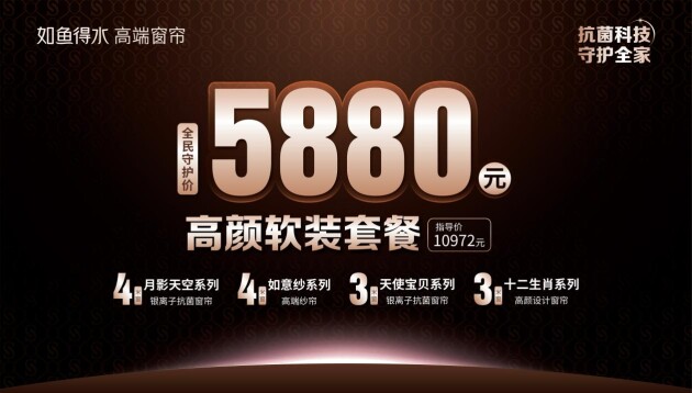 此次推出的5880元高顏軟裝套餐,以守護系列銀離子抗菌窗簾作為主力產(chǎn)品,其套餐內(nèi)容包含了4米月影天空系列主臥窗簾,3米的十二生肖系列次臥窗簾,3米的天使寶貝系列兒童房窗簾,3.5米的如意紗系列隱私紗簾,全面兼顧整裝需求,并可基于消費者的不同需求為其匹配多種套餐組合,真正將實惠落到實處,用實打?qū)嵉漠a(chǎn)品、實打?qū)嵉姆?wù)、實打?qū)嵉膬?yōu)惠,邁出品牌高端化戰(zhàn)略發(fā)展的第一步,讓廣大消費者切實感受到如魚得水對居家健康的全新詮釋。助力精英人群打造高品質(zhì)、有品味的理想舒適家居空間,是別墅、大平層家裝的首選套餐。