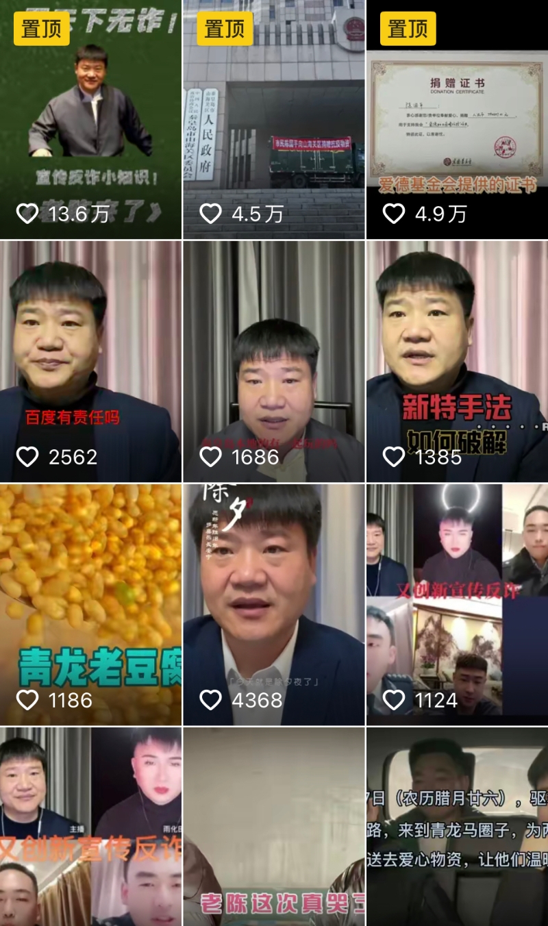 短視頻平臺上,老陳的賬號已更名為“熱心老陳”,直播動態(tài)顯示,他今年已直播40余場。他的短視頻也一直更新,不少是關于反詐的。不同的是,他會定期公布自己的直播收入,以及做公益的進度等。