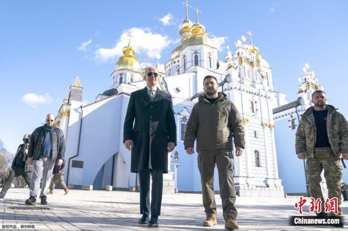 當?shù)貢r間2023年2月20日,美國總統(tǒng)拜登與烏克蘭總統(tǒng)澤連斯基在烏克蘭首都基輔一教堂前會面交談。