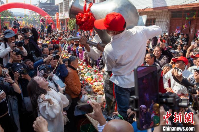 中新網(wǎng)福建長(zhǎng)汀2月21日電 (丘偉華)2月21日,農(nóng)歷二月初二龍?zhí)ь^,“客家首府”福建省龍巖市長(zhǎng)汀縣濯田鎮(zhèn)升平村的一年一度“百壺宴”民俗活動(dòng)火熱進(jìn)行,斗轎、游神、喝“?!本?,熱鬧且壯觀的場(chǎng)面吸引眾多游客、攝影愛好者慕名前來一睹風(fēng)采。