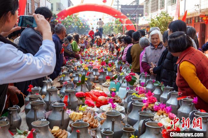 因客家話“壺”以“?!敝C音,“百壺宴”又稱為“百福宴”,幾百年來當(dāng)?shù)匕傩粘幸u著這獨(dú)特的活動(dòng),表達(dá)了祈求新年福氣滿滿、風(fēng)調(diào)雨順、國(guó)泰民安的樸素愿望。
