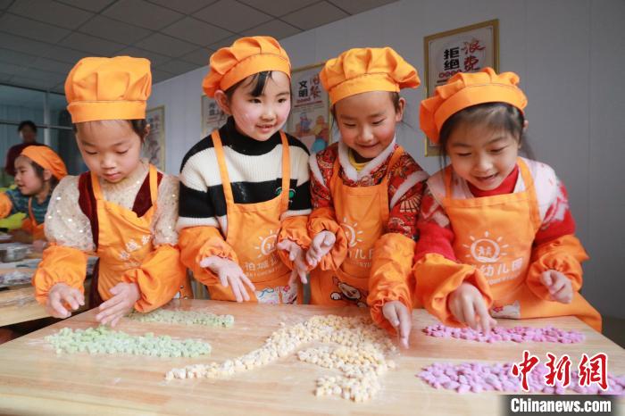 在濰坊市高密市柏城鎮(zhèn)中心幼兒園,孩子們用面旗子擺出“二月二”字樣?!±詈?攝