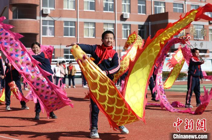 臨沂市沂南縣湖頭鎮(zhèn)中心小學(xué)的學(xué)生在表演舞龍慶“二月二”。 杜昱葆 攝