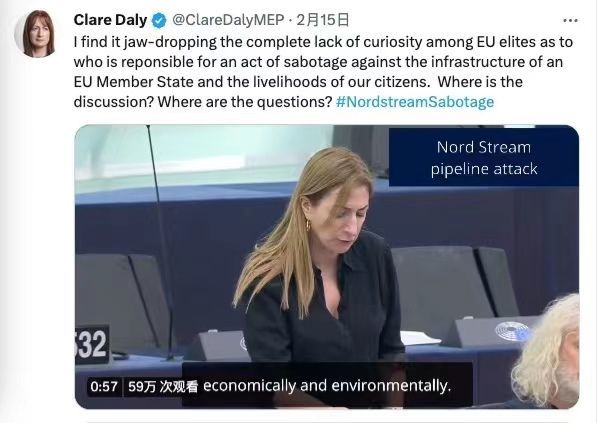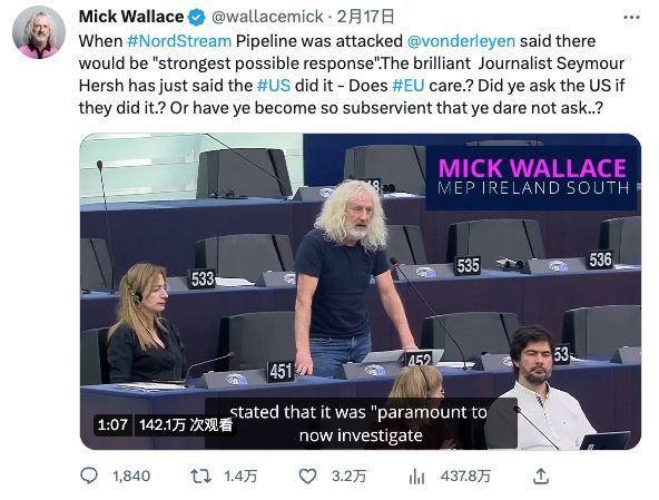 關(guān)注“北溪”事件真相的是兩名愛爾蘭籍議員——米克·華萊士和克萊爾·戴利。華萊士在發(fā)言中質(zhì)疑說,在去年9月“北溪”管道遭破壞后,歐盟委員會(huì)主席馮德萊恩曾口口聲聲說調(diào)查工作“至關(guān)重要”、任何對(duì)歐洲能源供給的蓄意破壞“不可接受”,還發(fā)誓歐盟將作出“最強(qiáng)烈回應(yīng)”,但如今美國記者赫什爆料美國是破壞管道的幕后主使,歐洲卻沉默了。