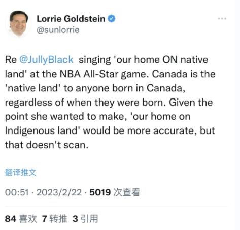 多倫多《太陽報》專欄作家洛麗·戈爾茨坦在推特上寫道:“對于任何在加拿大出生的人來說,加拿大都是‘家園和故土’,無論他們何時出生?!?/p>