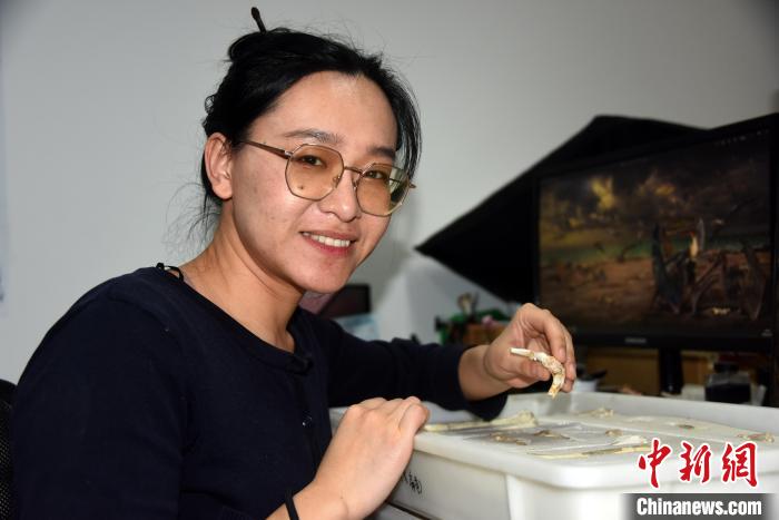 中科院古脊椎所博士吳倩介紹本次研究成果。 中新社記者 孫自法 攝