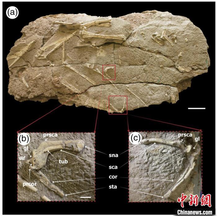 與哈密翼龍頭骨等化石保存在一起的肩帶標本?!≈锌圃汗偶棺邓?供圖