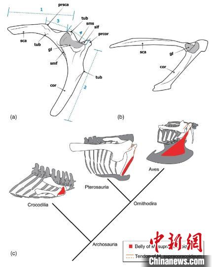一是形態(tài)學研究方面,通過對哈密翼龍肩帶進行計算機斷層掃描(CT)三維模型重建和形態(tài)學分析表明,翼龍喙上肌如同鳥類一樣繞行頂烏喙突內側連接肱骨近端,頂烏喙突可實現(xiàn)類似的滑輪功能,翼龍可能如鳥類一樣利用喙上肌收縮實現(xiàn)翅膀上揚。