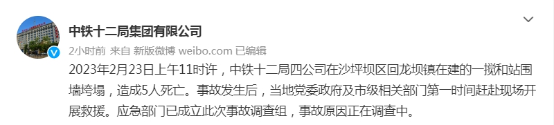 中新網(wǎng)2月23日電 據(jù)中鐵十二局集團(tuán)有限公司官方微博消息,2023年2月23日上午11時(shí)許,中鐵十二局四公司在沙坪壩區(qū)回龍壩鎮(zhèn)在建的一攪和站圍墻垮塌,造成5人死亡。