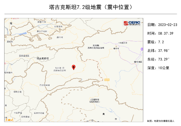 中新網(wǎng)2月23日電 據(jù)國家地震臺網(wǎng)官方微博消息,中國地震臺網(wǎng)正式測定:02月23日08時37分在塔吉克斯坦(北緯37.98度,東經(jīng)73.29度)發(fā)生7.2級地震,震源深度10千米。
