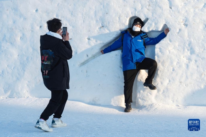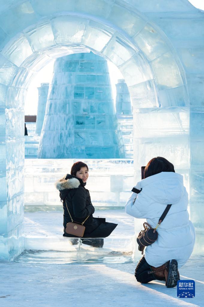 2月25日,游客在哈爾濱冰雪大世界園區(qū)留影。