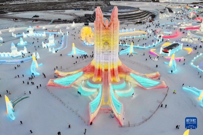 2月25日,游客在哈爾濱冰雪大世界園區(qū)游玩(無(wú)人機(jī)照片)。