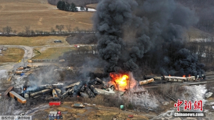 資料圖:當(dāng)?shù)貢r(shí)間2月3日晚,美國(guó)俄亥俄州東北部發(fā)生一起火車(chē)脫軌事件,隨后引發(fā)大火。圖為事故現(xiàn)場(chǎng)部分火車(chē)在燃燒。
