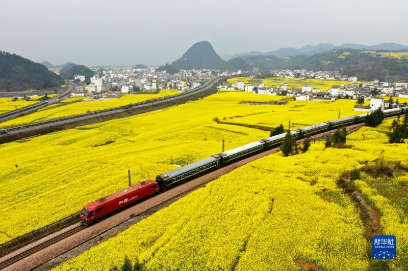 2月27日,旅游專列行進(jìn)在云南曲靖市羅平縣的油菜花海中(無(wú)人機(jī)照片)。