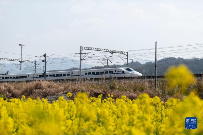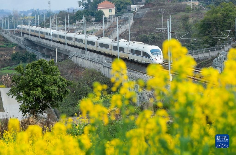 2月27日,動(dòng)車組列車行駛在四川省瀘州市龍馬潭區(qū)境內(nèi)。