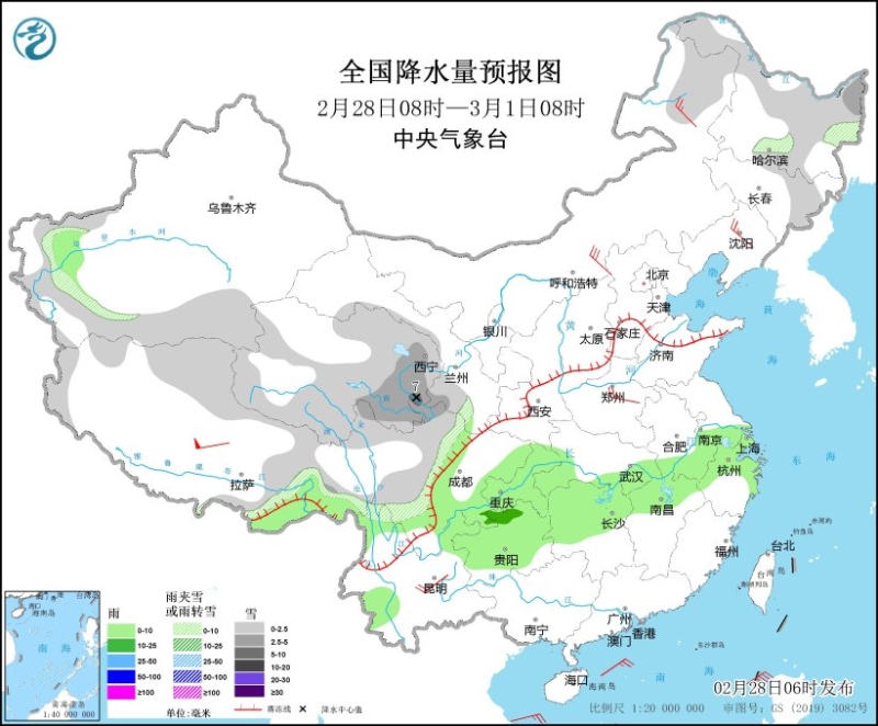 2月28日08時至3月1日08時,內(nèi)蒙古東部、黑龍江大部、吉林東部、新疆南疆盆地、西藏東部、青海東部和南部、甘肅東部等地部分地區(qū)有小到中雪或雨夾雪,其中,青海東南部等地部分地區(qū)有大雪(5~7毫米)。西藏東南部、四川南部、重慶、貴州大部、湖北南部、湖南中部和北部、江西北部、安徽南部、浙江北部等地部分地區(qū)有小到中雨。內(nèi)蒙大部、東北地區(qū)大部、華北、黃淮等地部分地區(qū)有5~7級風(fēng),其中,西藏北部部分地區(qū)有7~8級風(fēng)。