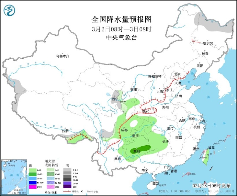 此外,2月28日至3月1日,青藏高原的部分地區(qū)有小到中雪,局地大雪;2月28日至3月3日,西南地區(qū)東部等地有小雨,局地中雨。
