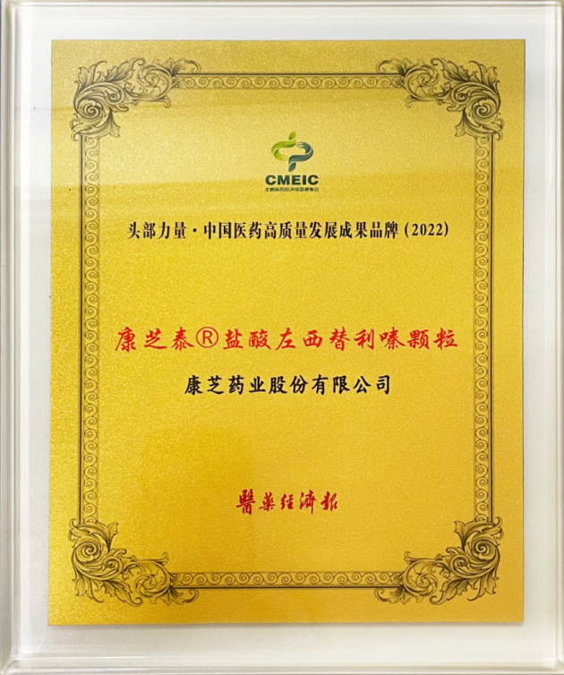 康芝泰?鹽酸左西替利嗪顆粒獲得“頭部力量 中國醫(yī)藥高質(zhì)量發(fā)展成果品牌”獎項