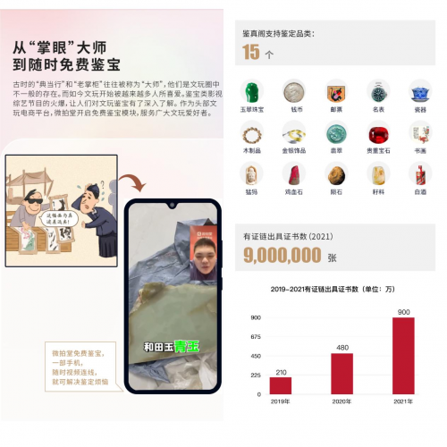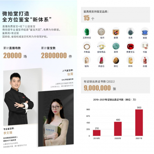 2015年,微拍堂APP上線后不久,微拍堂就建立了以“鑒真閣”為基礎(chǔ)的權(quán)威鑒定體系,與近20家國(guó)家級(jí)、省級(jí)、行業(yè)級(jí)權(quán)威機(jī)構(gòu)達(dá)成戰(zhàn)略合作,并啟動(dòng)“有證鏈”計(jì)劃,為用戶打造一個(gè)足不出戶就可知真假的多品類一站式鑒定服務(wù)平臺(tái)。2021年,使用微拍堂“有證鏈”出具的證書數(shù)已達(dá)900萬(wàn)張。