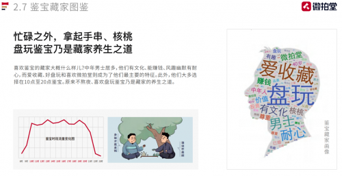 不僅如此,通過(guò)白皮書的統(tǒng)計(jì),人們對(duì)鑒寶藏家的畫像也變得越來(lái)越清晰。這一群體以中年男士居多,他們有文化、能賺錢、風(fēng)趣幽默有耐心,而愛(ài)收藏、好盤玩和喜歡微拍堂則成為了他們最主要的共同特征。此外,他們大多選擇在10點(diǎn)至20點(diǎn)鑒寶。原來(lái)不熬夜、喜歡盤玩鑒寶乃是藏家的養(yǎng)生之道。