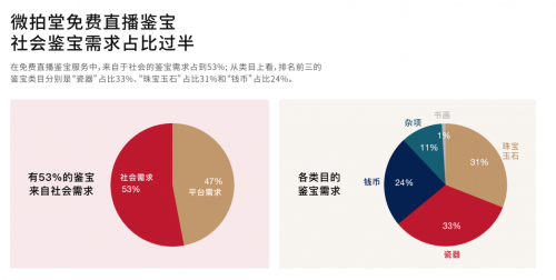 值得一提的是,白皮書數(shù)據(jù)顯示,在免費(fèi)直播鑒寶服務(wù)中,來(lái)自于社會(huì)的鑒寶需求占到53%,超過(guò)了從微拍堂平臺(tái)購(gòu)買產(chǎn)品用戶的鑒寶需求。這充分說(shuō)明,微拍堂通過(guò)免費(fèi)直播鑒寶在傳播鑒寶知識(shí)、推動(dòng)鑒寶文化發(fā)展上已具有一定影響力,無(wú)形中擔(dān)起了文化傳播的社會(huì)責(zé)任。