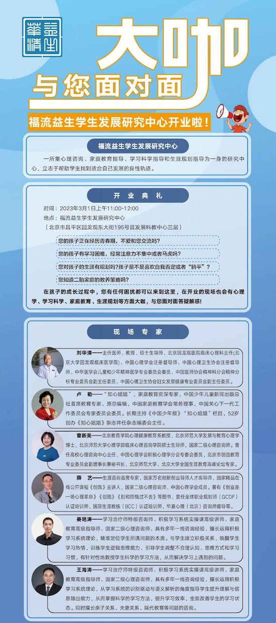 未來(lái),福流益生學(xué)生發(fā)展研究中心將大力開(kāi)展形式多樣的心理知識(shí)普及活動(dòng)、個(gè)案咨詢(xún)服務(wù)、學(xué)生學(xué)科定向及生涯發(fā)展咨詢(xún),以促進(jìn)學(xué)生心理建設(shè)制度化、規(guī)范化、專(zhuān)業(yè)化,為學(xué)生的心理健康、科學(xué)學(xué)習(xí)和生涯發(fā)展提供強(qiáng)有力的保障。2023年3月1日的開(kāi)業(yè)活動(dòng)也將云集臨床心理學(xué)、家庭教育、學(xué)習(xí)科學(xué)、生涯規(guī)劃方面的6位專(zhuān)家,現(xiàn)場(chǎng)為市民解答學(xué)生發(fā)展方面的困惑。