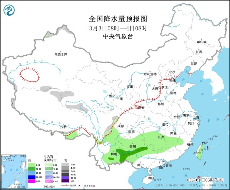 3月2日08時至3日08時,新疆南部山區(qū)、西藏東北部、青海東部、甘肅南部、黑龍江北部等地的部分地區(qū)有小到中雪或雨夾雪,其中,新疆西南部山區(qū)等地局地大雪(5~8毫米);甘肅東部、陜西南部、四川東部和南部、重慶、貴州、云南東部、湖南、廣西西部和北部等地的部分地區(qū)有小到中雨。內(nèi)蒙古東北部、西藏西部、浙江等地的部分地區(qū)有4~6級風(fēng)。東海大部、臺灣海峽、南海北部和中部和西南部海域有5~7級、陣風(fēng)8級的偏北風(fēng)。