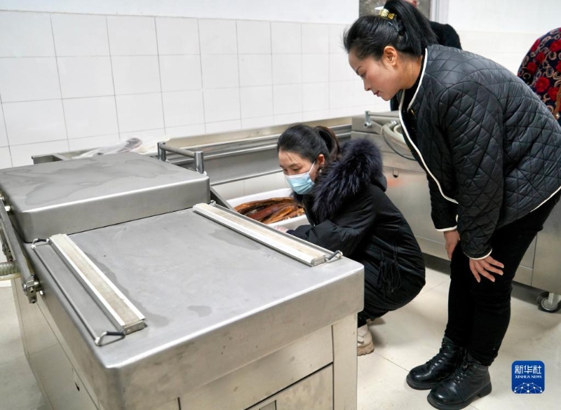 陳貴靜在白鹿頂山貨加工基地和工人一起包裝臘肉禮盒(2月16日攝)。新華社記者 薛晨 攝