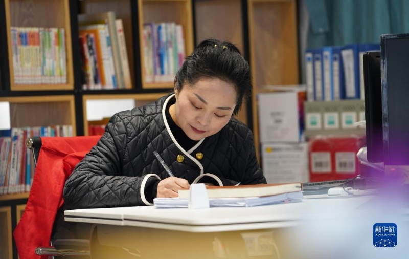 陳貴靜在四川省彭州市白鹿頂村村委會(huì)辦公室寫材料(2月16日攝)。新華社記者 薛晨 攝