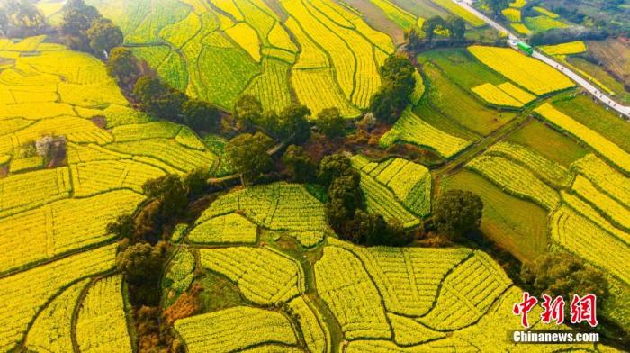 圖為航拍金燦燦的油菜花競(jìng)相綻放,春日風(fēng)光美不勝收。