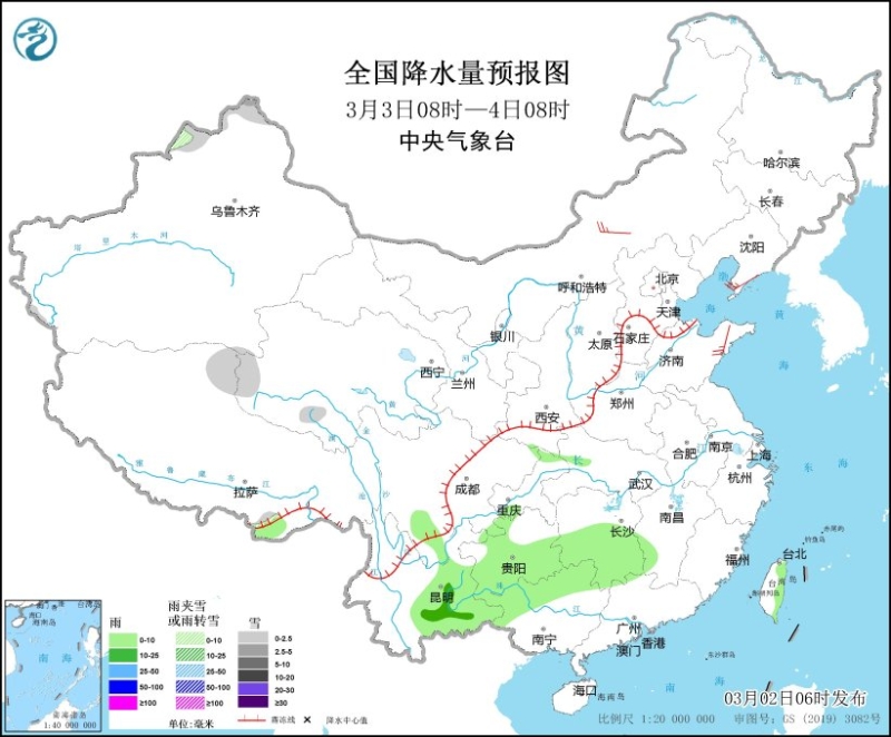 3月2日08時(shí)至3日08時(shí),黑龍江北部、新疆南疆西部山區(qū)、西藏北部、青海東部、甘肅中南部等地部分地區(qū)有小到中雪或雨夾雪,其中,新疆南疆西部山區(qū)等地局地有大雪(5~8毫米)。陜西南部、西南地區(qū)東部和南部、湖南西部等地部分地區(qū)有小到中雨。內(nèi)蒙古、東北地區(qū)、河北東部和南部、浙江北部等地部分地區(qū)有4~5級(jí)風(fēng)。渤海、東海大部、臺(tái)灣海峽、南海中北部和西南部海域有5~7級(jí)風(fēng),陣風(fēng)8級(jí)。