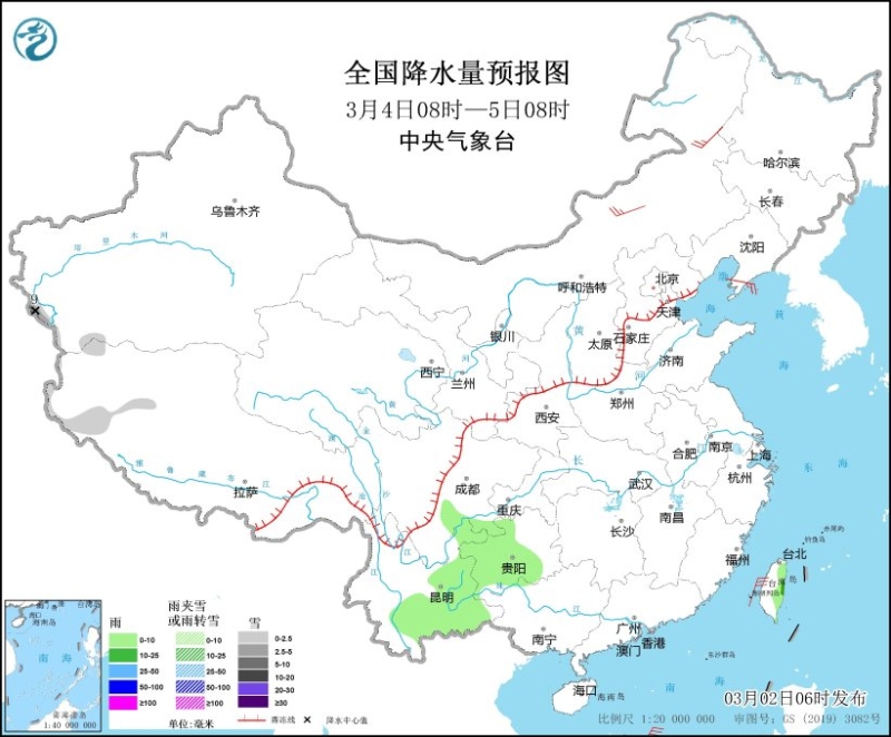 3月4日08時(shí)至5日08時(shí),新疆南疆西部山區(qū)、西藏西部等地部分地區(qū)有小到中雪,局地有大雪(5~9毫米)。四川南部、貴州中西部、云南中南部等地部分地區(qū)有小到中雨。內(nèi)蒙古中東部、遼東半島等地部分地區(qū)有4~5級(jí)風(fēng)。臺(tái)灣海峽、巴士海峽、南海中東部海域有5~7級(jí)風(fēng),陣風(fēng)8級(jí)。