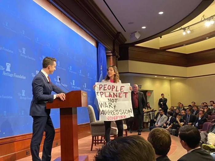 美國共和黨參議員喬希?霍利演講期間,非政府組織“粉色代碼”成員上臺抗議,并稱“中國不是我們的敵人,氣候危機(jī)才是?!?圖片來源:非政府組織“粉色代碼”網(wǎng)站