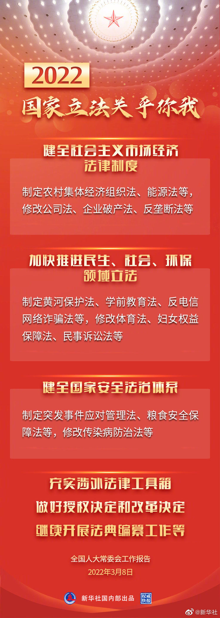 【權威快報丨2022國家立法關乎你我】8日提請十三屆全國人大五次會議審議的全國人大常委會工作報告,透露2022年度國家立法“發(fā)力點”。目前2022年度預安排審議40件法律案,你最關注哪些立法?(記者:楊維漢、陳菲、王琦)