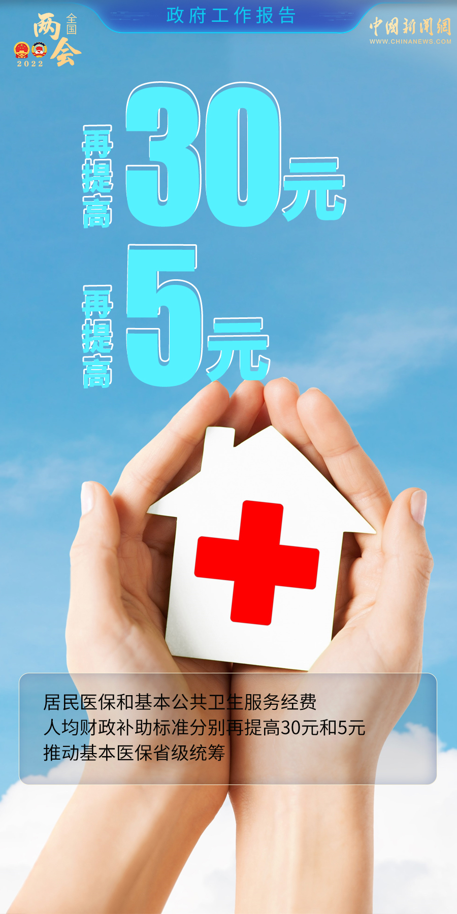 居民醫(yī)保和基本公共衛(wèi)生服務經(jīng)費人均財政補助標準分別再提高30元和5元,推動基本醫(yī)保省級統(tǒng)籌。