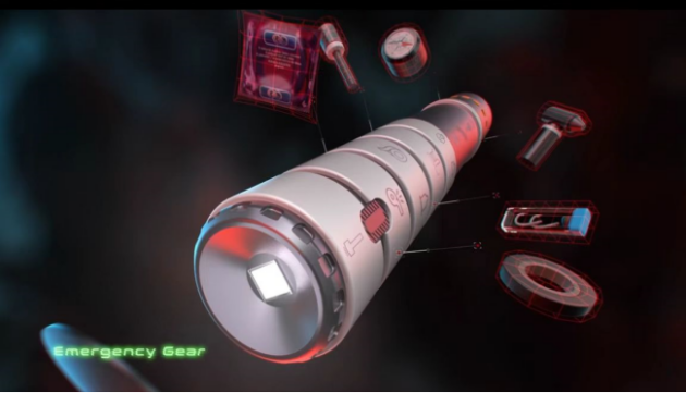 求生倉1號(hào)的頭部會(huì)配置一個(gè)指南針,尾部則內(nèi)置一個(gè)戰(zhàn)術(shù)電筒,方便在黑暗中進(jìn)行觀察。根據(jù)不同的需求使用,還可以通過旋轉(zhuǎn)對(duì)應(yīng)倉位去分拆對(duì)應(yīng)儲(chǔ)物倉或者轉(zhuǎn)換求生倉1號(hào)的形態(tài),其中第二節(jié)倉位可以調(diào)節(jié)為一個(gè)高硬度的錘頭用于應(yīng)急防御和擊打求生。