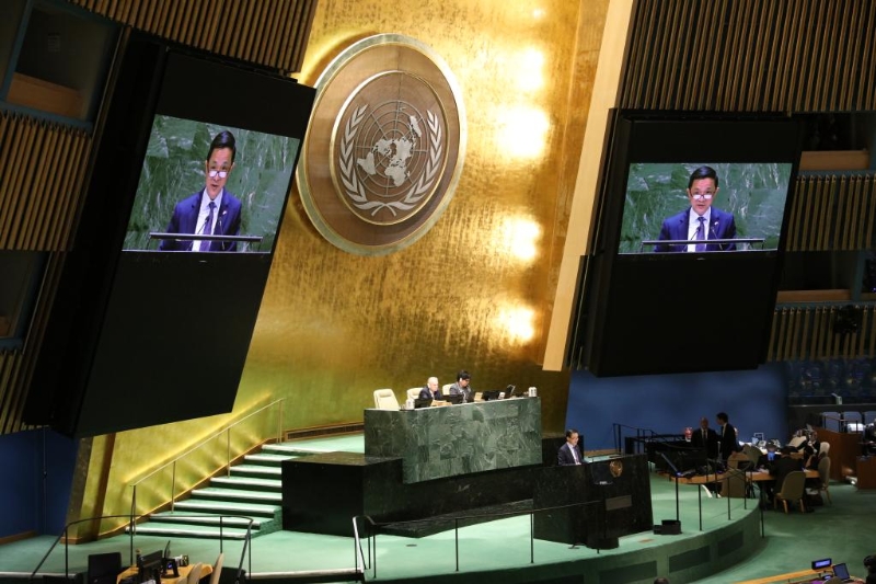 2月23日,在位于紐約的聯(lián)合國總部,中國常駐聯(lián)合國代表團(tuán)臨時(shí)代辦戴兵在聯(lián)合國大會(huì)烏克蘭問題緊急特別會(huì)議上指出,無論困難多大,政治解決的大門不能關(guān)上,推動(dòng)盡快實(shí)現(xiàn)?;鹬箲?zhàn)是當(dāng)務(wù)之急,輸送武器不會(huì)帶來和平。新華社記者謝鍔 攝