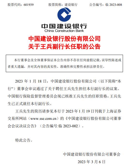 建設(shè)銀行6日發(fā)布的公告顯示,2023年1月18日,建設(shè)銀行董事會審議通過了關(guān)于聘任王兵擔任建設(shè)銀行副行長的議案。中國銀保監(jiān)會現(xiàn)已核準王兵的任職資格,王兵已正式就任建設(shè)銀行副行長。