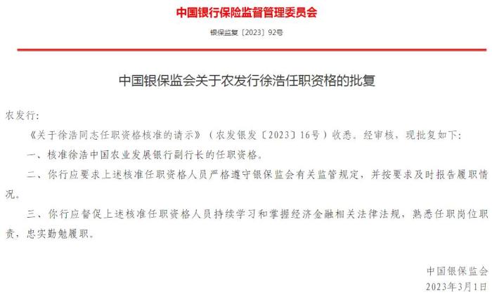 中國銀保監(jiān)會6日公布的《中國銀保監(jiān)會關(guān)于農(nóng)發(fā)行徐浩任職資格的批復》顯示,核準徐浩中國農(nóng)業(yè)發(fā)展銀行副行長的任職資格。