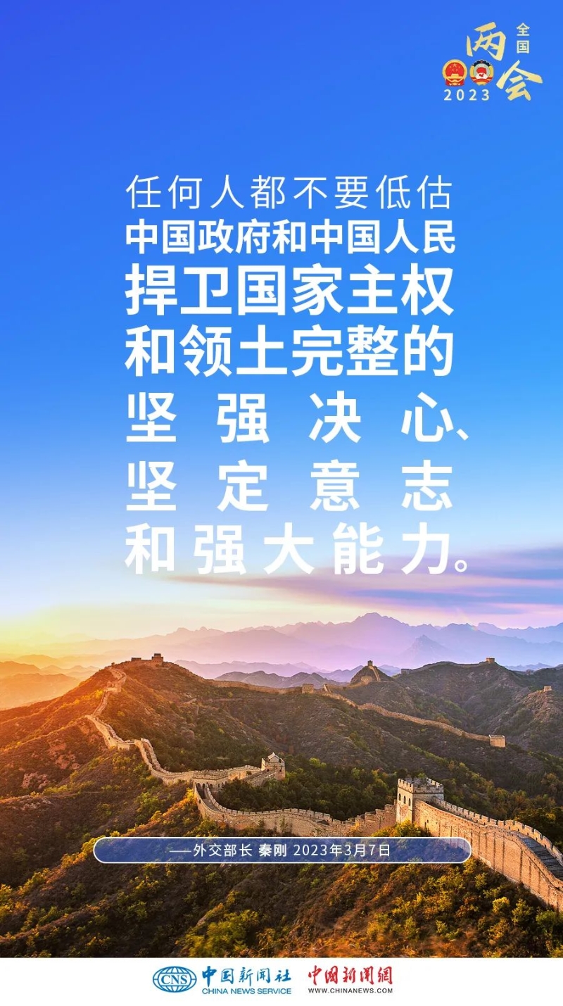 秦剛當(dāng)天表示,對(duì)于兩岸來(lái)說(shuō),我們都有一個(gè)家,名字叫中國(guó)。作為骨肉同胞,我們將繼續(xù)以最大誠(chéng)意、盡最大努力實(shí)現(xiàn)祖國(guó)和平統(tǒng)一。同時(shí),保留采取一切必要措施的選項(xiàng)。中國(guó)《反分裂國(guó)家法》對(duì)此規(guī)定得很明確。如果出現(xiàn)了違反該法的情況,我們必須依憲依法行事。任何人都不要低估中國(guó)政府和中國(guó)人民捍衛(wèi)國(guó)家主權(quán)和領(lǐng)土完整的堅(jiān)強(qiáng)決心、堅(jiān)定意志和強(qiáng)大能力。