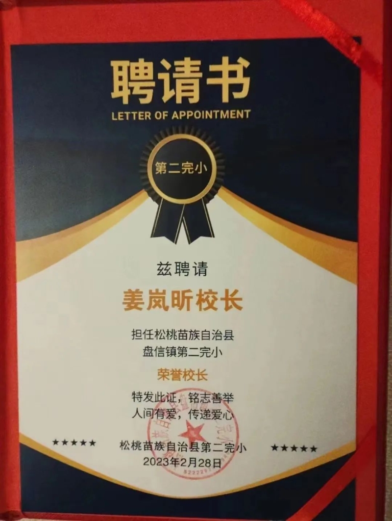 2023年教育資源得到有效改善的松桃苗族自治縣第二完小為感謝姜嵐昕老師及各位愛心企業(yè)和企業(yè)家對學(xué)校的教育幫扶的公益善舉,表達了深深的感謝和崇高的敬意,特別聘請姜嵐昕老師為松桃苗族自治縣第二完小的榮譽校長。