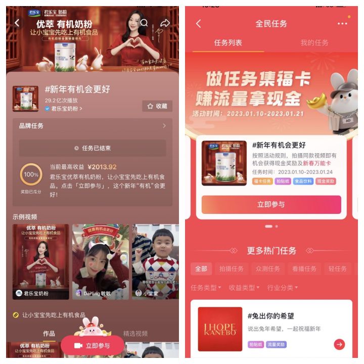 基于新一代母嬰人群所追求沉浸感和參與感,信賴場景式安利、沉浸式感受,因而優(yōu)萃有機奶粉攜手巨量引擎在基礎品牌信息的純曝光宣傳之外,共創(chuàng)了一系列多元互動玩法,如找紅包、集節(jié)氣卡、挑戰(zhàn)賽貼紙等,在點燃新春氛圍的同時加深了品牌與用戶深度互動,尤其是在抖音上發(fā)起的 #新年有機會更好 的話題挑戰(zhàn)賽,優(yōu)萃有機奶粉的有機賣點持續(xù)多次露出,活動各頁面上“優(yōu)萃有機奶粉,讓小寶寶先吃上有機食品”高度吸睛,最大程度覆蓋了用戶的目光所及之處,高密度投放且集中化曝光使得優(yōu)萃有機奶粉品牌價值理念在用戶心智中形成深刻記憶點。